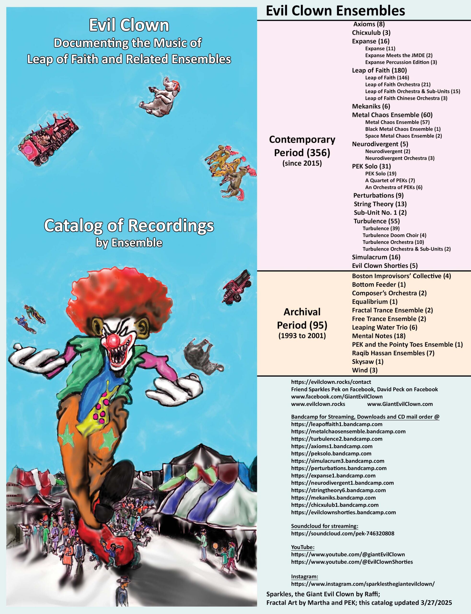 Contemporary Ensembles (2015 to Present) Leap of Faith Metal Chaos Ensemble Turbulence Axioms PEK Solo Simulacrum Perturbations Expanse Sub-Unit No 1 Evil Clown Shorties
