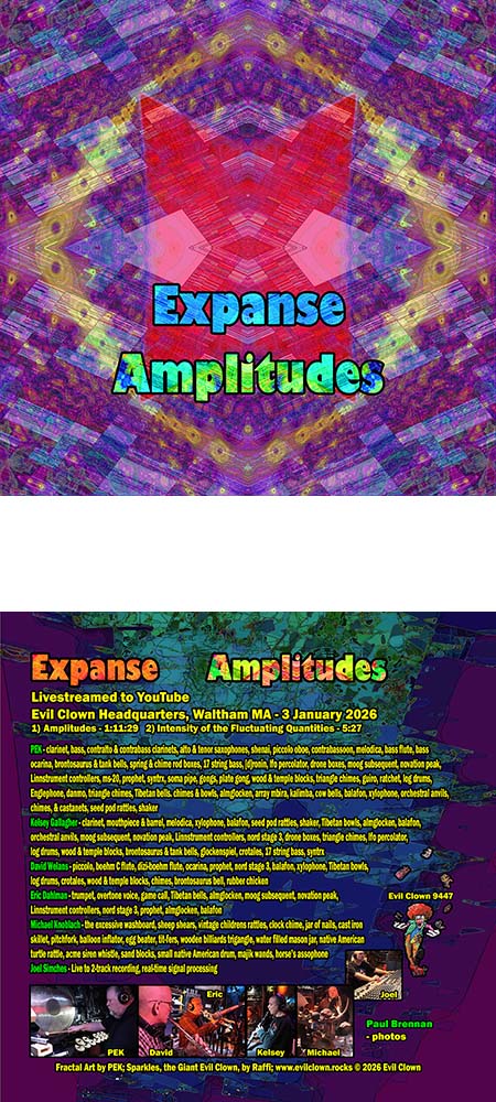 Not long ago, David reached out and said he was ready to do some sessions again, so I set up this one with 4 of the 5 players from the Expanse meets the JMDE Quartet sessions and with newbie Kelsey Gallagher replacing Jimmy Zhao on clarinet. David, Eric and Michael played a lot together as a unit with a lot of subtle and quieter sounds. The origins of Expanse explored this territory, but as time has gone on, we have trended a bit towards larger ensembles and bigger sonorities. Amplitudes returns to this space, having a lower mean dynamic than most Evil Clown sessions so the quieter sounds speak clearly. We all enjoyed this quintet lineup for Expanse, and I will calendar this Expanse Edition for more performance in the future.