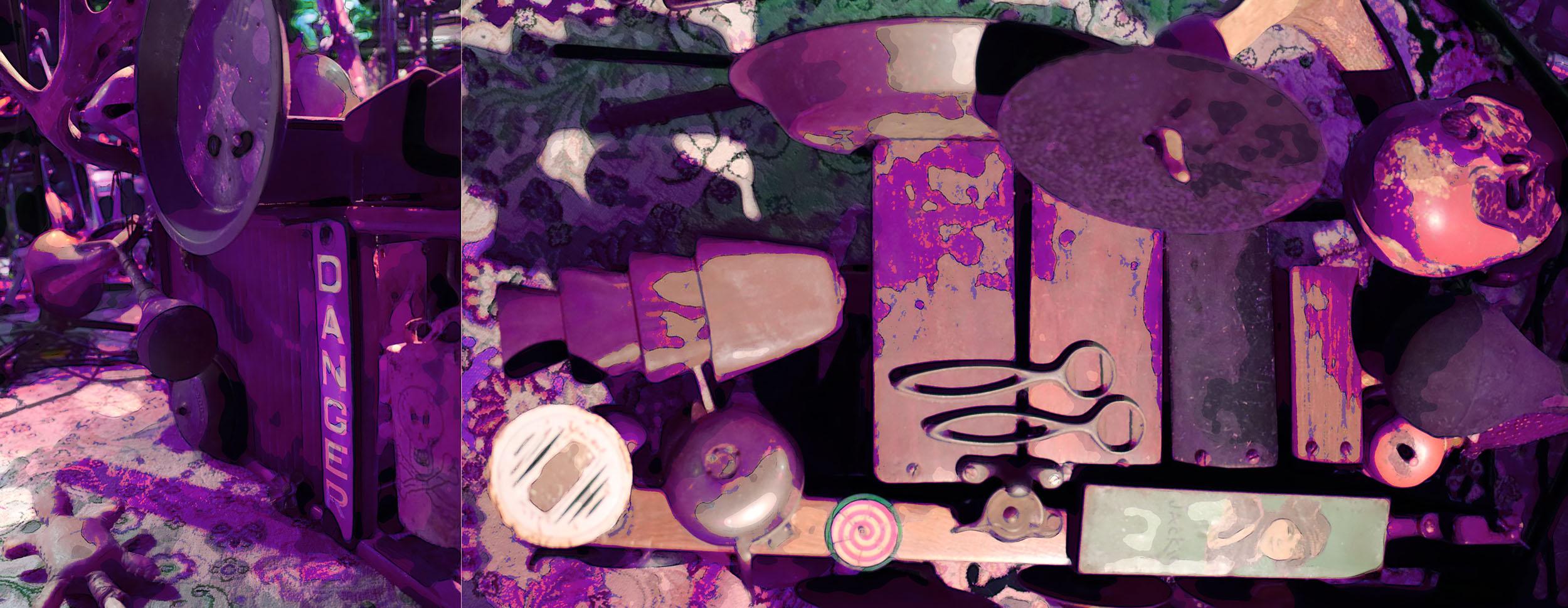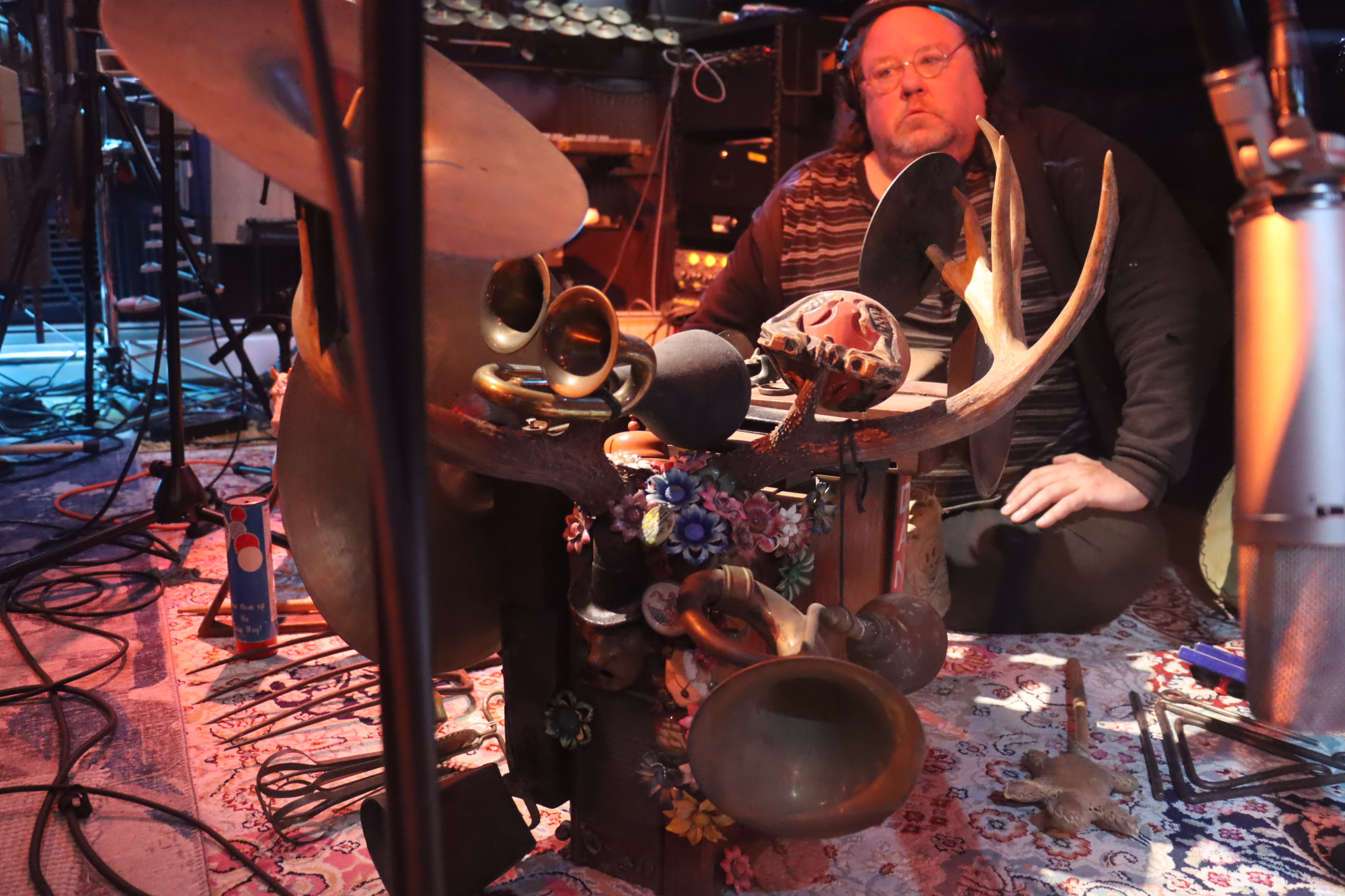 Michael Knoblach – the excessive washboard, sheep shears, vintage childrens rattles, clock chime, jar of nails, cast iron skillet, pitchfork, balloon inflator, egg beater, tit-fers, wooden billiards trigangle, water filled mason jar, native American turtle rattle, acme siren whistle, sand blocks, small native American drum, majik wands, horse’s assophone