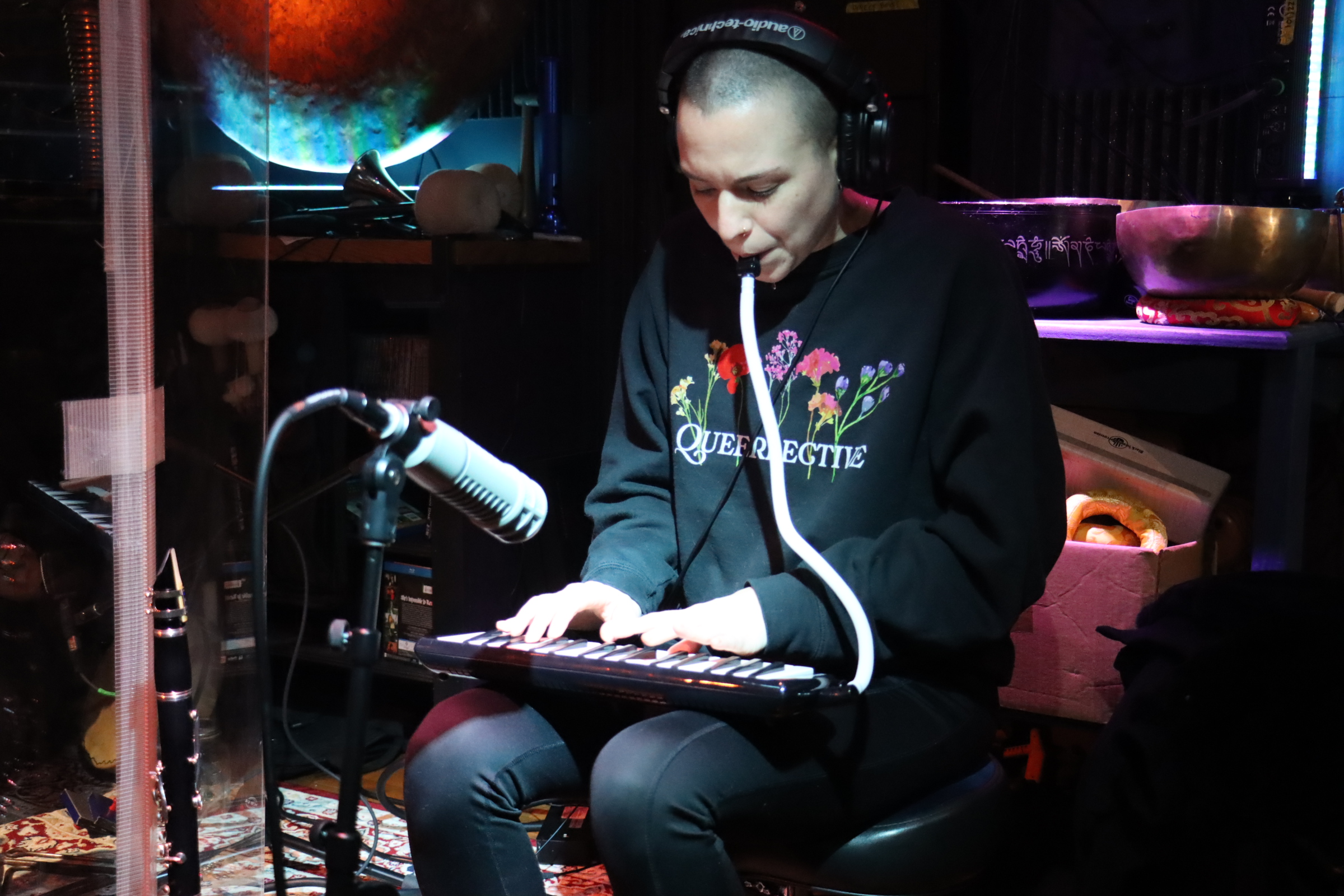 Kelsey Gallagher – clarinet, mouthpiece & barrel, melodica, xylophone, balafon, seed pod rattles, shaker, Tibetan bowls, almglocken, balafon, orchestral anvils, moog subsequent, novation peak, Linnstrument controllers, nord stage 3, drone boxes, triangle chimes, lfo percolator, log drums, wood & temple blocks, brontosaurus & tank bells, glockenspiel, crotales, 17 string bass, syntrx