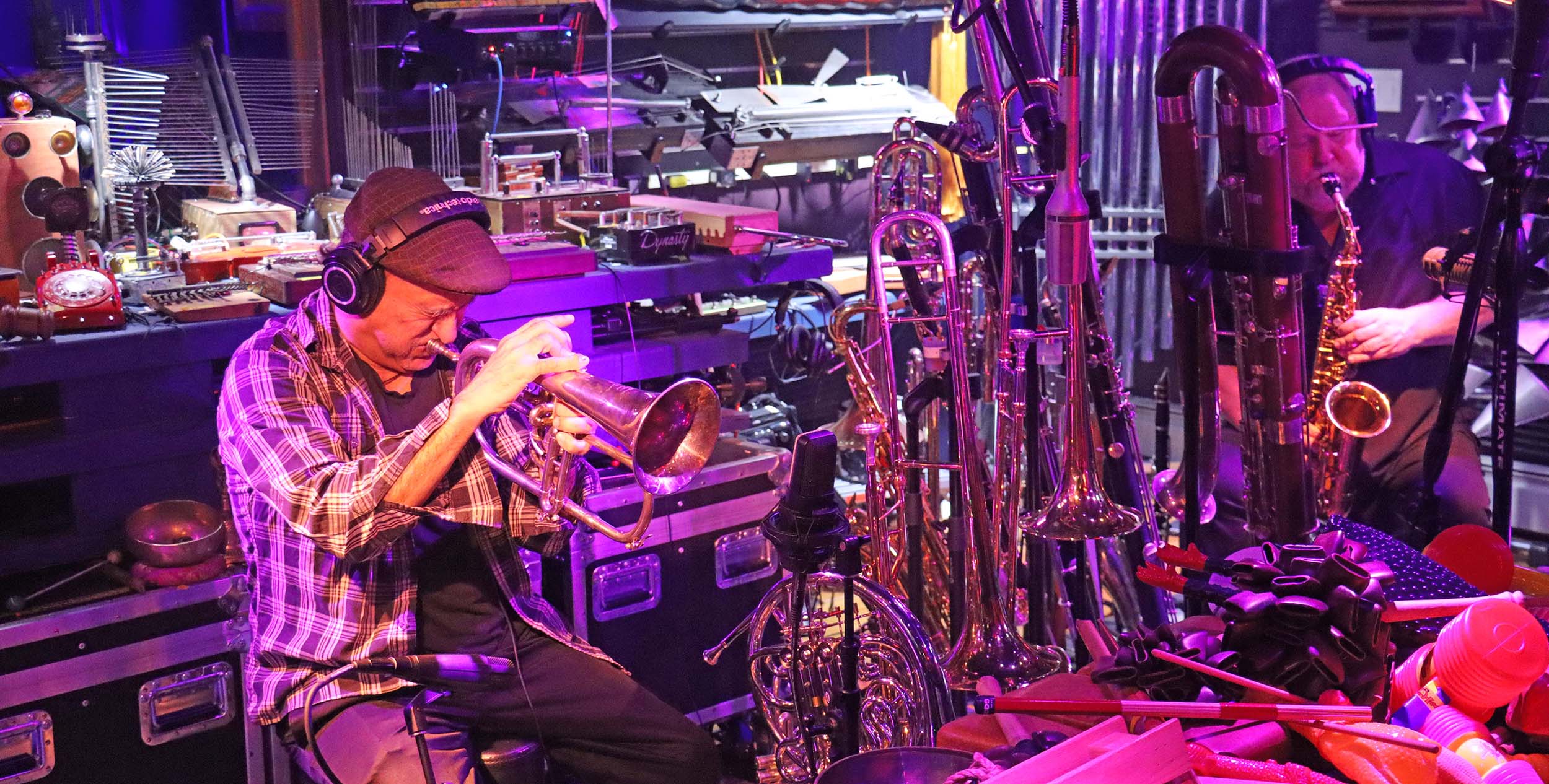 PEK – clarinet, albert bass, contralto & contrabass clarinets, alto & tenor saxophones, glissophone, English horn, shenai, medieval horn, goat horn, triple slide whistles, Christmas flute, game calls, sheng, melodica, daxophone, wind siren, moog subsequent, novation peak, Linnstrument controllers, ms-20, sonic forrest, sonic spring board, drone boxes, lfo percolator, 17-string bass, [d]ronin, orchestral chimes, Englephone, danmo, crotales, glockenspiel, wood & temple blocks, log drums, trine, gongs, plate gong, brontosaurus & tank bells, Tibetan bells, bowls & chimes, captain’s bell