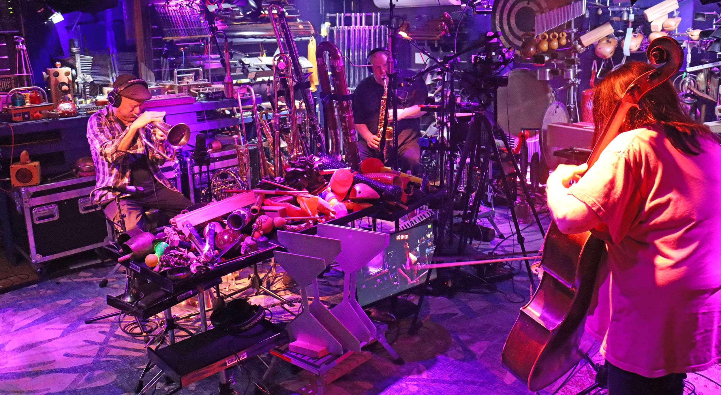 This trio has performed as a trio with no others only on three previous occasions: Coherent Alternatives (6/11/22), Action as Thought, Thought as Action (7/28/2022), and Interconnected by Testable Relations (11/18/2023). It’s always interesting to revisit previous configurations after some time has passed and further development has occurred in other contexts. Several things are different since this trio’s earlier sets: the new Evil Clown Studio is complete, and John has expanded his brass playing to include French horn and his playing generally to the Evil Clown Studio Instrument (what I call the collection of instruments permanently available in the space).