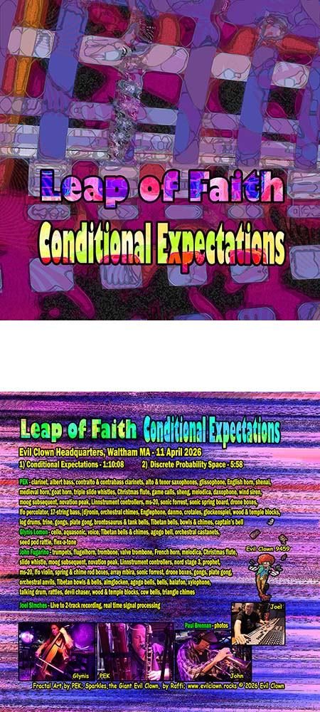 Leap of Faith is the core duet of the Leap of Faith Orchestra (LOFO) comprised of PEK on clarinets, saxophones, double reeds & flutes, and Glynis Lomon on cello, aquasonic & voice. The ensemble is based in Boston and dates back to the early 90s. We utilize a huge arsenal of additional Evil Clown instruments to improvise long works featuring transformations across highly varied sonorities. At times, the core unit has been a trio or even a quartet. The longest running core unit was comprised of PEK, Glynis and drummer Yuri Zbitnov, who played for the last couple of years of the archival period and the first 5 years of the reboot starting in 2015. The ensemble has always been highly modular, and our many recordings (well over 100) feature the core unit in dozens of configurations with a huge list of guests and occasionally as only the core unit with no guests. Currently, the core unit is the duet of PEK and Lomon and we are regularly presenting LIVESTREAMs to YouTube from Evil Clown Headquarters with other guest performers.