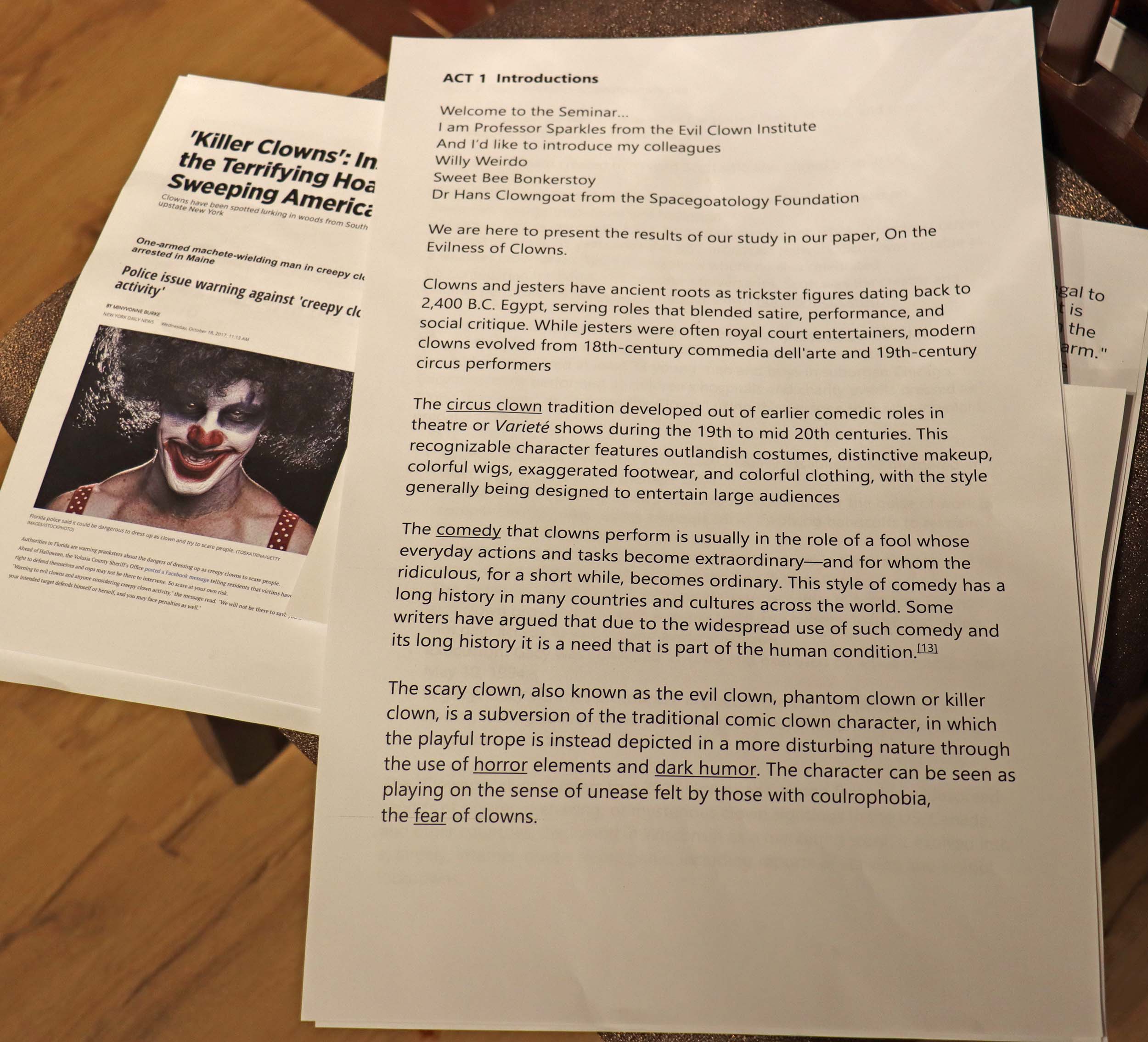 Over time I have spent more effort planning the narrative arch for these performances. I spent much more time thinking about and preparing for On the Evilness of Clowns than any of the previous performances. Having a plan means there is more focused story telling, but the flow and the actual words are still improvised in the moment. Here we had an overall premise that the performance was the presentation of a paper on Evil Clowns by some Clown Academics, a little clown history lecture, discussion of real Evil Clowns Ronald McDonald and John Wayne Gacy, appearance of Evil Clowns in Art and Cinema, and some of the story of Sparkles the Giant Evil Clown. I had enough clown horns, wigs and noses to go around.