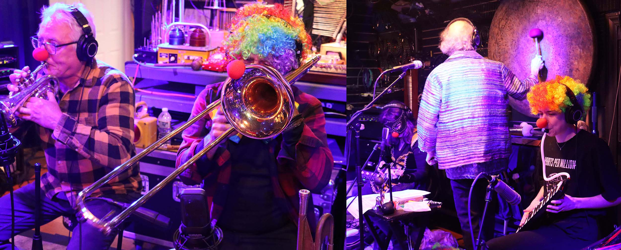 Professor Sparkles (aka PEK) – wacky banter, clarinet, albert bass, contralto & contrabass clarinets, alto & tenor saxophones, game calls, triple slide whistle, ocarinas, captain’s bells, Tibetan bells & chimes, [d]ronin, 17 string bass, sonic spring board, crank siren, gongs, plate gong, seed pod rattles, sleigh bells, brontosaurus & tank bells, orchestral castanets, clown & taxi horns