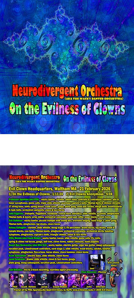 While most of the Evil Clown ensembles perform strictly instrumental music that does not contain words, a few of the bands do use words and I like how the text provides an entry point for the audience to access the music.  Metal Chaos Ensemble uses text from literature and movies and Axioms uses the Poetry of the amazing poet Jane SpokenWord who recites her words in small ensembles which also feature the amazing bass playing of her husband Albey onBass.  In these settings, the words come from fixed text, but the delivery and the choice of which words and when to place them are improvised.  In Neurodivergent, the improvisation of the words is on another level… None of the text is fixed in advance; all the words are improvised in reaction to the Wacky Banter of the others.  This music contains a great deal of playfulness and humor which is often lacking in the world of pure improvisation.  I have long valued humor in music as a method of engaging people and I think this band is the best example so far of an Evil Clown ensemble which centers humor as a critical element.
