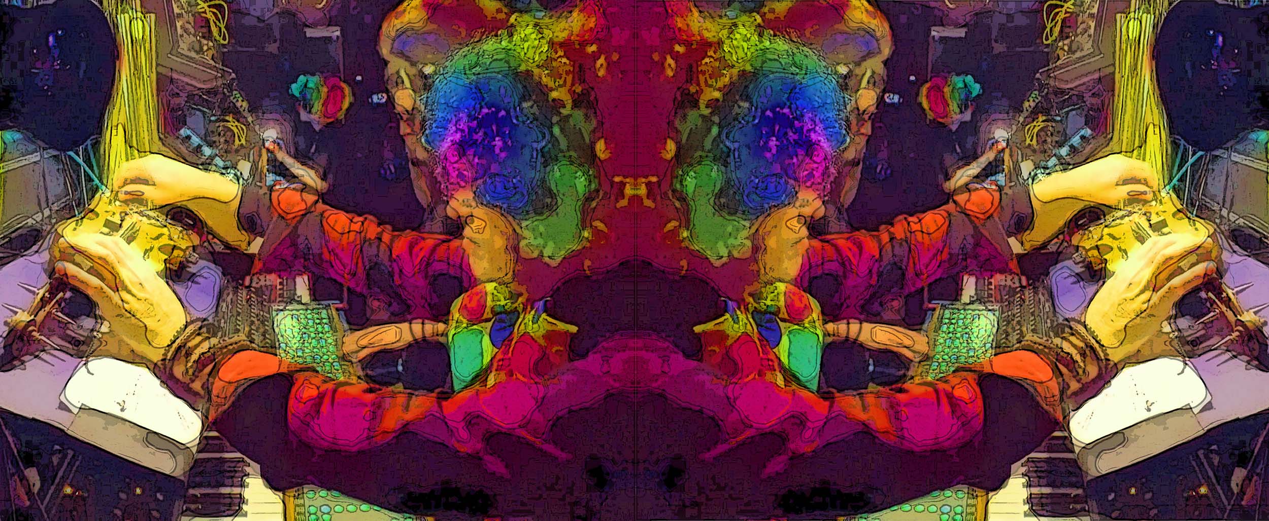 Sweet Bee Bonkerstoy (aka DNA Girl) – wacky banter, electric guitar, cigar box guitar, moog subsequent, novation peak, Linnstrument controllers, nord stage 3, slide whistle, wood blocks, ratchet, balafon, xylophone, almglocken, flex-a-tone, horse shoes, clown hammer, clown horns