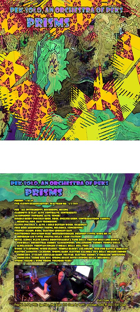 PEK SOLO / AN ORCHESTRA OF PEKS – Prisms (Evil Clown 9270; USA) When let loose in his studio unencumbered, Dave PEK can make one helluva brave noise. In the company of other like-minded souls in the loose affiliation that is the Evil Clown contingent, PEK and his cohorts often rain their sounds down upon us from the heavens like so much angry manna; solo, PEK opens the floodgates so to speak, and what makes each of his realizations so utterly enthralling is the sheer wonder and awe of it all. On this outing, PEK strives to wrench order out of the disparate strands of the universe, to physically wrestle with his variegated motifs and make sense of the individual components. Hah! As the Borg say, resistance is futile, so we’re again swept up in the PEK solo maelstrom, mere whipping boys to his acid-tongued reflexes and gift for paranormal gab. He expresses himself in ways that often defy belief, whether it’s the alien sax wailings that parry with the spastic electronic choreography bursting out around the seventeen minute index, or when he revisits hues colored dark and dusky and arching out of space forty energizing minutes in. Speaking of space, PEK eventually mutes the earthbound cavities of his rustic brass to probe the Mariana trenches of the blackened cosmos as this powerful sonic architecture widens and defines itself further, to the point where, as it finally concludes, we’re situated in some fifth world hybrid where synthetic fauna bungle in the jungle and androids dream of electric sheep. Yowza.