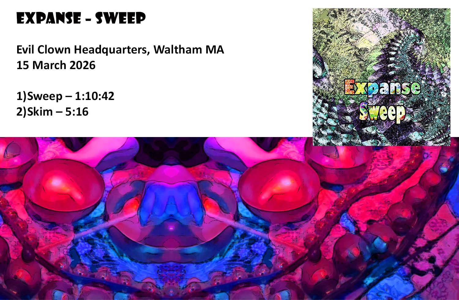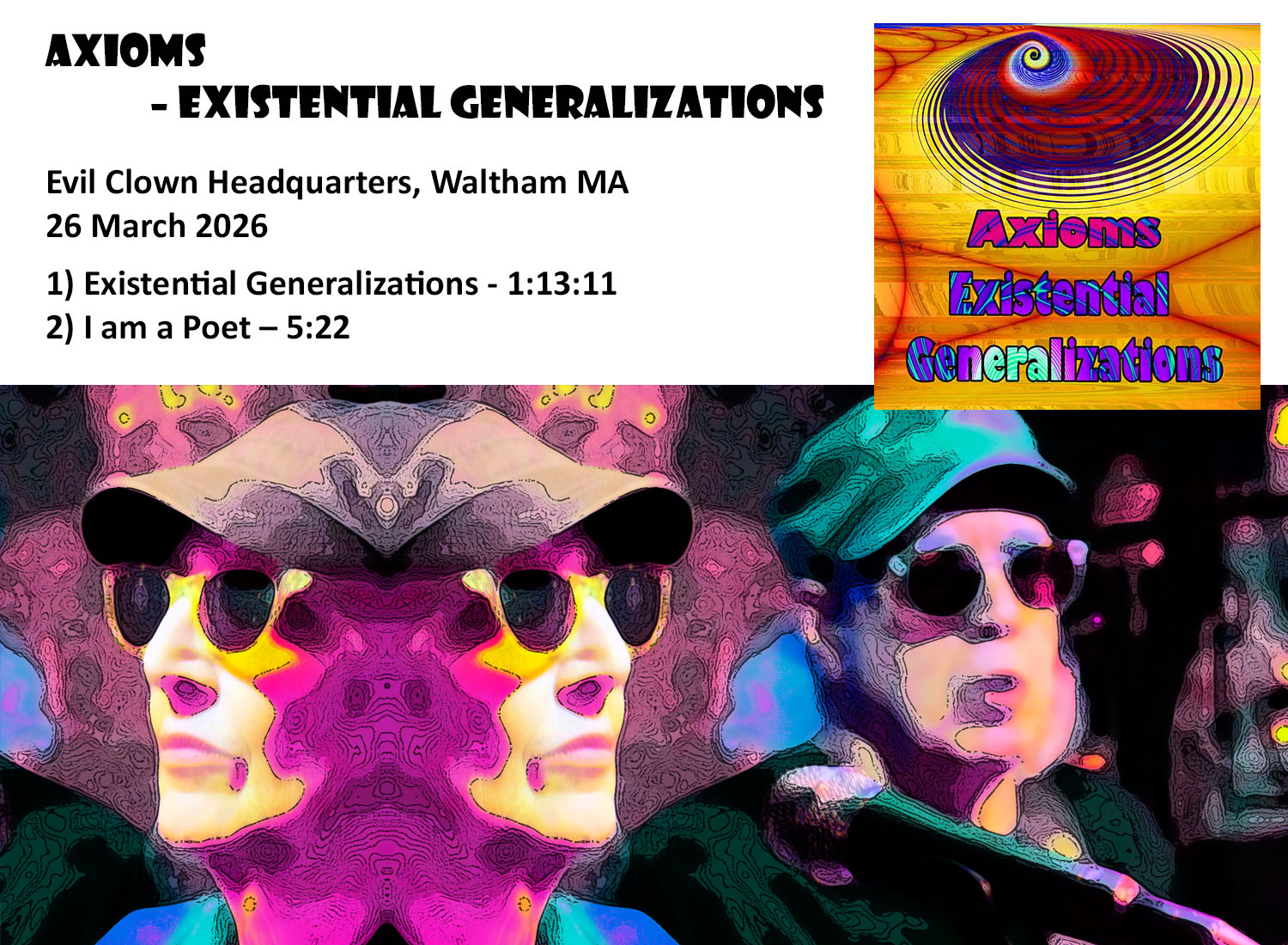 2026 is the Year in Progress at Evil Clown Headquarters. As the year goes on each new performance will have a brief summary with a few images below which link out to the Evil Clown Album Page, Bandcamp Page for the album, YouTube Videos, Musician Bios, etc. Over the course of the year, each new Album is added to the top of the list in reverse-chronological order.