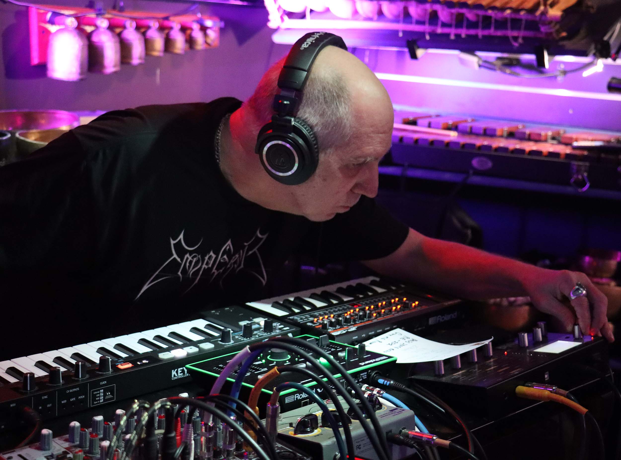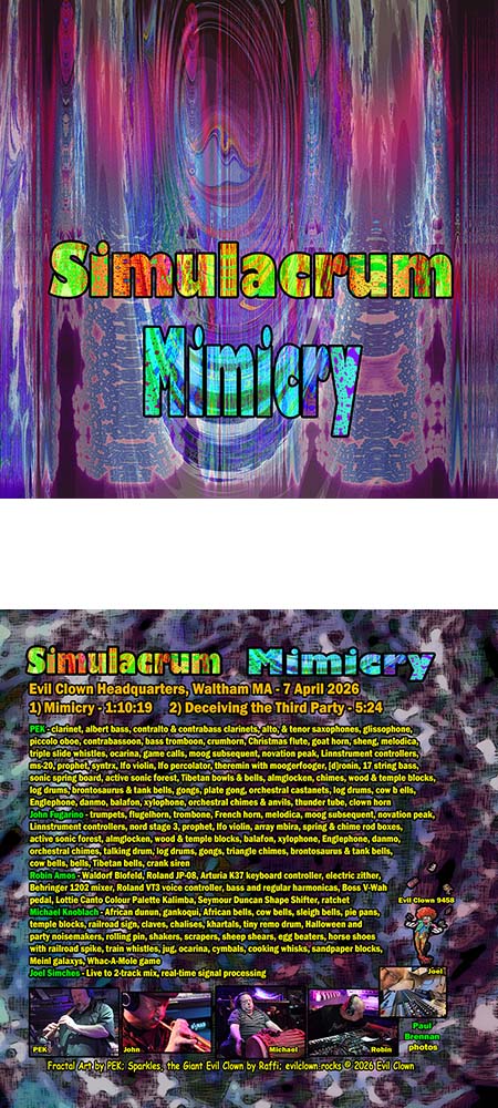 Simulacrum is an offshoot of Metal Chaos Ensemble that was conceived just prior to the Virus shutting things down. The ensemble originally featured 3 core members: PEK on all my stuff, Eric Woods on analog synth, and Bob Moores on space trumpet, guitar, and electronics. The original idea of this band was to increase the amount of electronics, to keep the ancillary percussion and lose the drum set, along with PEK and Bob holding down the horn roles. More recently, Bob moved to Maine about 3 hours away and Eric has been less available due to having young children. The focus on electronics is retained, but the players are more fluid.