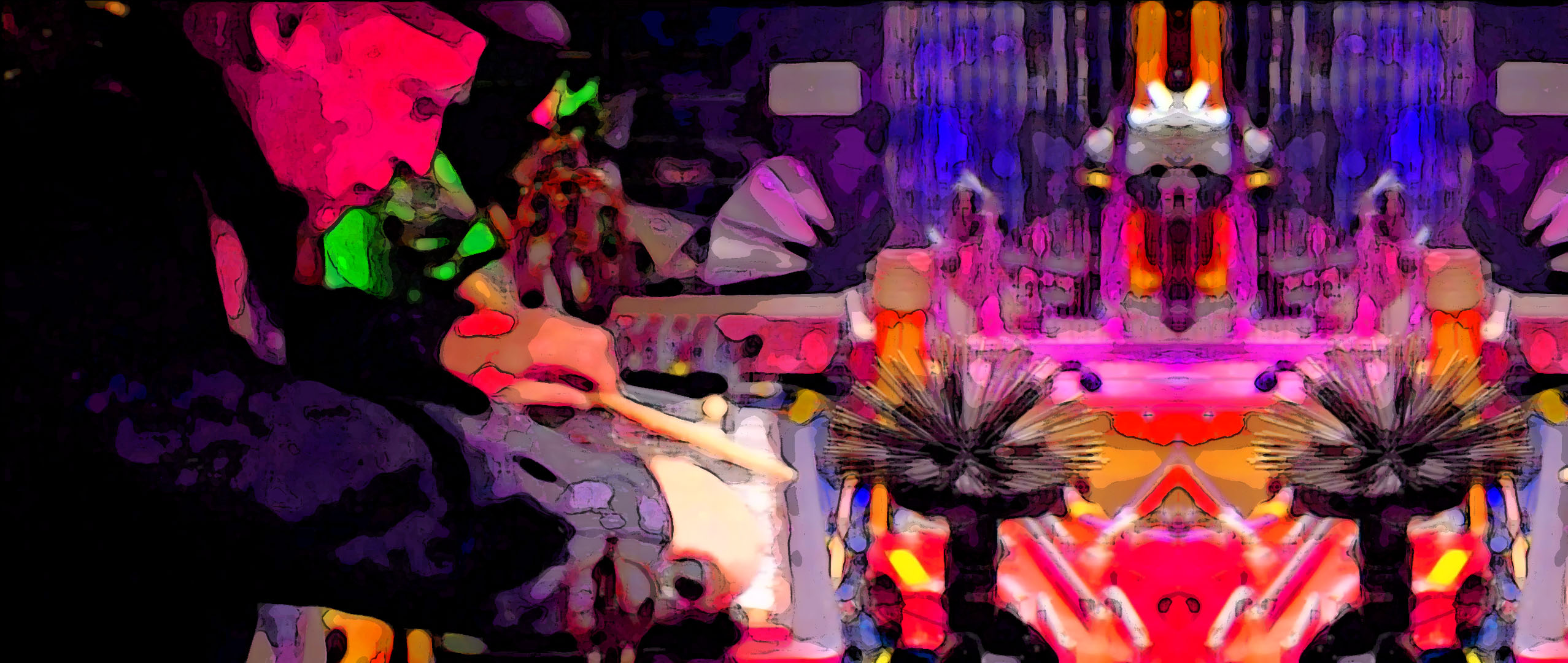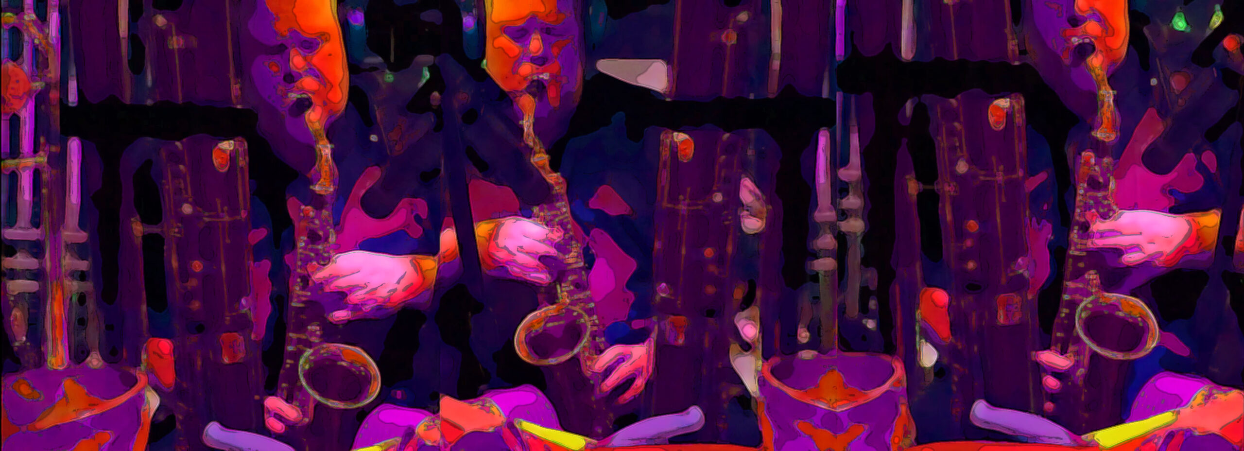 Sextet is plenty of performers, so of course we charged ahead with the available players like I always do, but I dropped “Orchestra” from the band name. The remaining ensemble is an example of what I call balanced: 2 reeds, 2 brass and 2 rhythm section. All the horn players spent time on the auxiliary percussion, electronic, and electro acoustic instruments which are permanently installed in the studio. The result is a great example of the broad palette aesthetic executed by an experienced group of hard core Evil Clown regulars. The piece naturally transforms through a long series of distinct sonorites as the players all execute instrument changes over the duration.