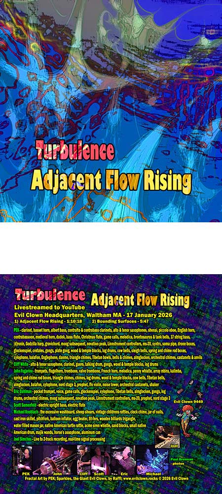 I formed Turbulence in 2015 as I started to assemble players for the Leap of Faith Orchestra. Turbulence, the extended horn section for the Orchestra (along with guests on other instruments), also records and performs as an independent unit. As if this writing in 2026, we have recorded over 65 albums on Evil Clown with greatly varied ensembles. All the smaller Evil Clown Ensembles are really more about a general approach, rather than a specific set of musicians. A session gets credited to Turbulence when it is mostly horn players and the only musician on all of them is me. The sessions range from an early duet with Steve Norton and me (Vortex Generation Mechanisms) to a 5-horn band with bass and two percussionists (Encryption Schemes) to four albums by the side project Turbulence Doom Choir which feature myself, multiple tubas, percussion, electronics, and signal processing and many other configurations. More recently, the Turbulence Orchestra and Sub-Units project has been performing twice a year in Brattleboro VT.