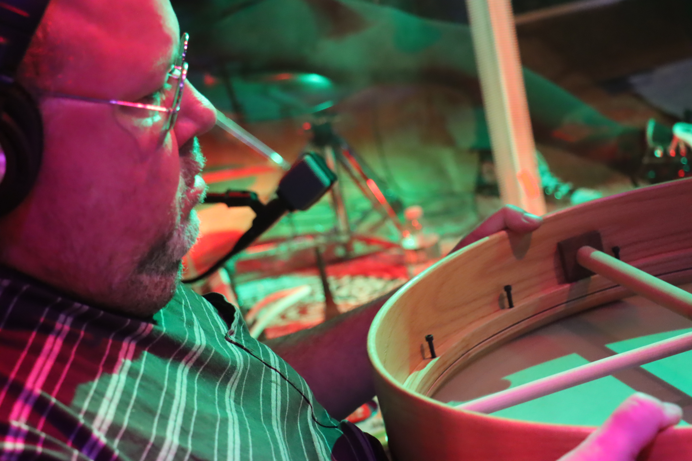Michael Knoblach – bodran, basket of rocks, meditation bells, slinky, riq with wooden zils, water filled mason jar, mortar & pestle, communion bells, sleigh bells, African rattles, seed pod rattles, axatse, copper bow, fisher price toys, wooden robot, sistum, vibratones, flex-a-tones, the farmer sings toy, marbles, metal chop sticks, meinl helix bowls, ratchet, boxing clown, devil chasers, abacus, lp udder