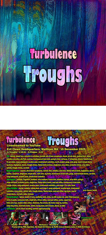 “… Troughs is the final Evil Clown performance of 2025 and it is an appropriately strong conclusion to the year and in a way a summary of some of the years major strides… Evil Clown recorded 37 new albums in 2025 (by Turbulence, Turbulence Orchestra, Turbulence Orchestra & Sub-Units, Expanse, Expanse Percussion Edition, Metal Chaos Ensemble, Leap of Faith, Neurodivergent Orchestra, & Simulacrum) – 35 as LIVESTREAMS from Evil Clown Headquarters and 2 in Live Performance. There were over 50 participants this year in the Evil Clown Roster, but 4 of the key performers are all here: PEK (that’s me), John Fugarino, Michael Caglianone, and Michael Knoblach. I’m on all, of course, John is on 32, Michael C is on 18, and Michael K is on 17. There are many horn players in the Roster, but John, Michael and I have played together either as the entire ensemble, a three horn front line, or part of a larger horn section on 16 of this year’s albums – As a consequence, our improvised interaction has become extraordinarily tight…”